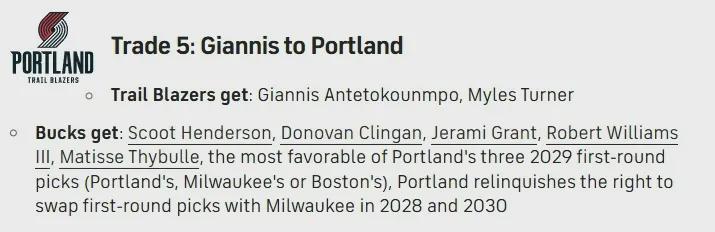 这段时间,开拓者竟然屡次传出了跟字母哥的“绯闻”。近日知名美媒CBS体育又为开拓者提供了一笔交易方案,即他们得到字母哥+特纳,送出亨德森+克林根+格兰特+罗威+塞布尔+三个29年首轮签中顺位最优的签位,同时放弃28年以及30年与雄鹿的首轮签互换权。